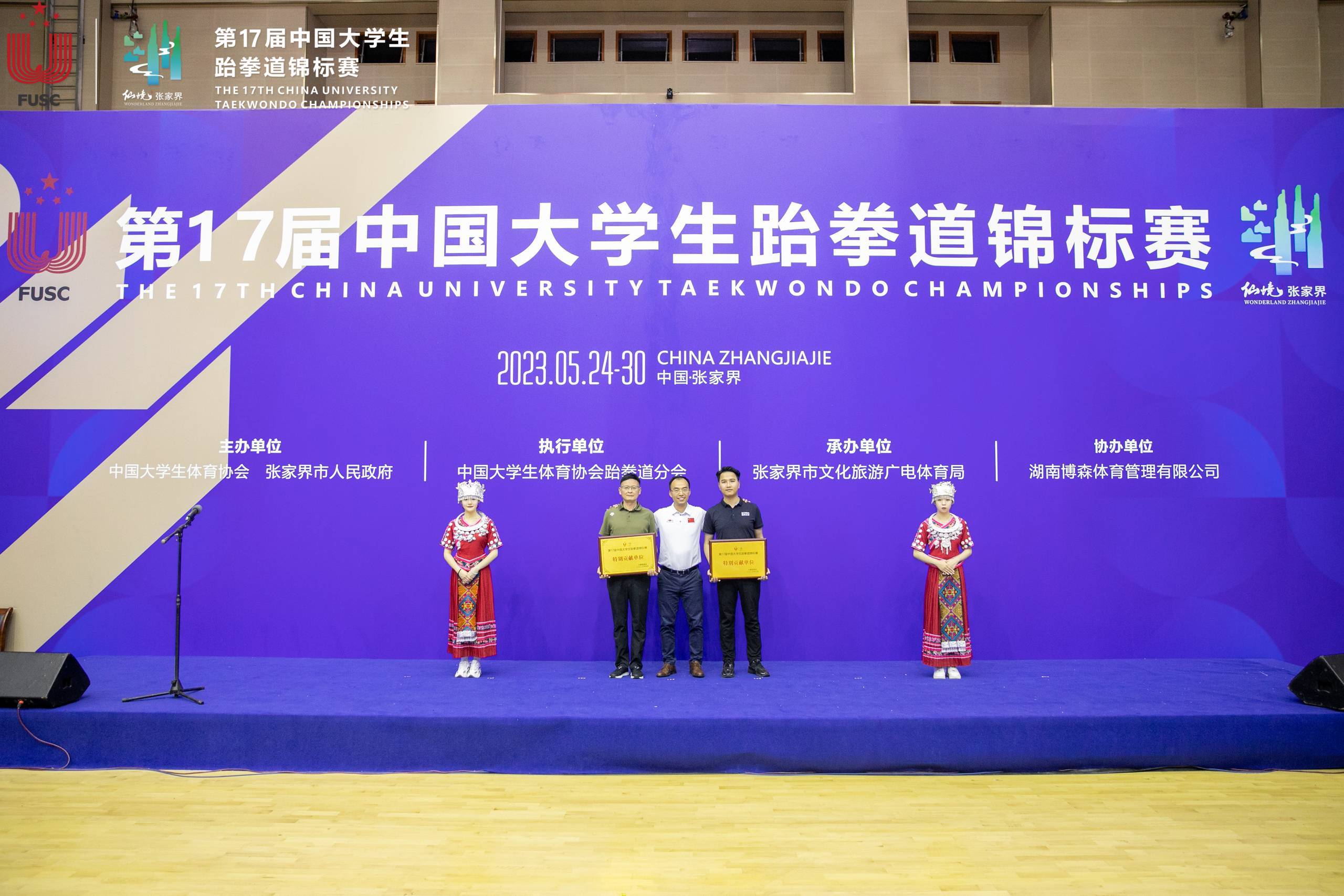 此次比賽,我司負責競賽組織、賽事宣傳、賽事接待服務等工作,具體包括運動員、教練員賽前接待服務;運動員、教練員賽中吃住行服務;賽事活動具體流程方案;志愿者、裁判員服務等工作。通過我司細心周到的賽事服務,確保了本屆錦標賽的圓滿成功,宣傳了跆拳道體育文化、促進了張家界文體消費增長。第17屆中國大學生跆拳道錦標賽閉幕式上,中國大學生體育協會跆拳道分會秘書長吳小勇為我司頒發“特別貢獻單位”獎項。